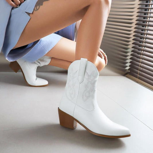 Mirror Patent Leather Embroidery Knee-high Women Boots Pointed Mid-calf Embroidery Chunky High HeelRegular price 22.540KWDRegular priceUnit price / per-