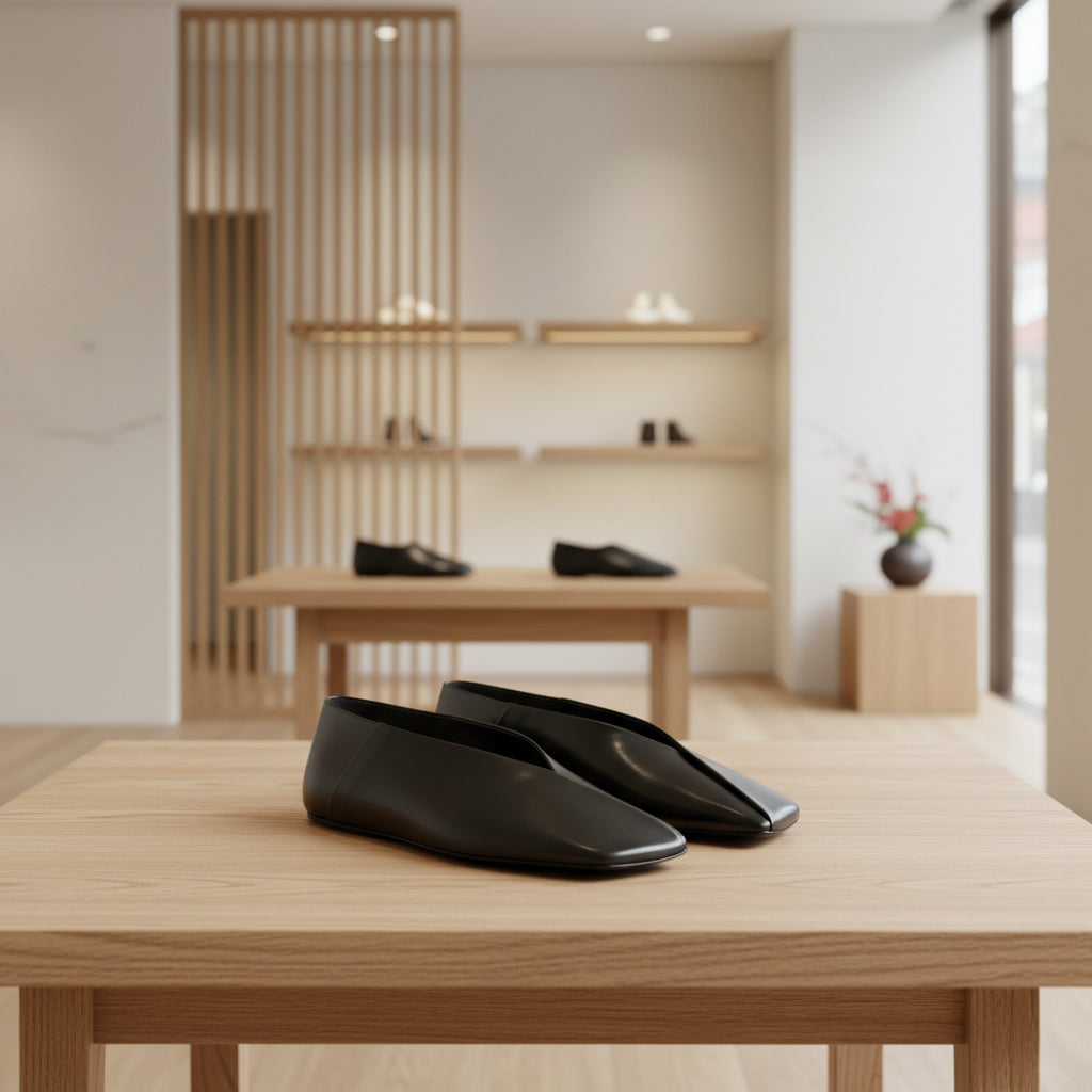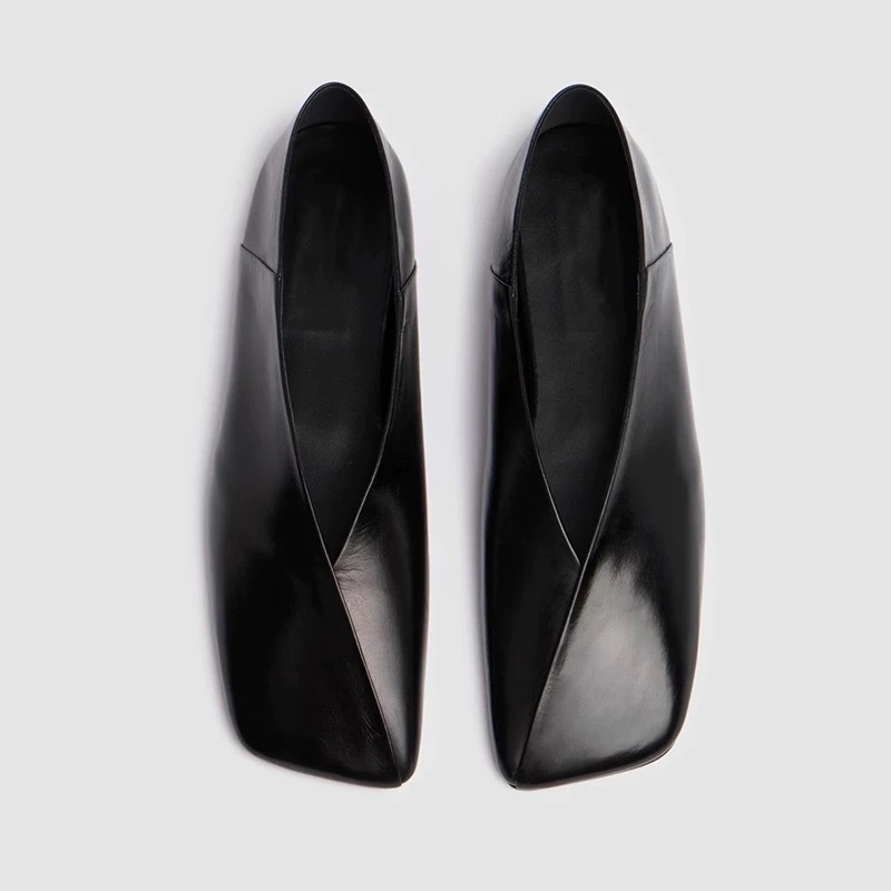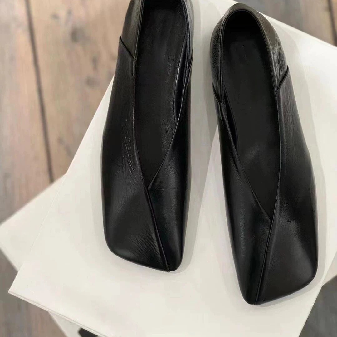 Womens Niche French-Style Genuine Leather V-Neck Square-Toe Flat Shoes